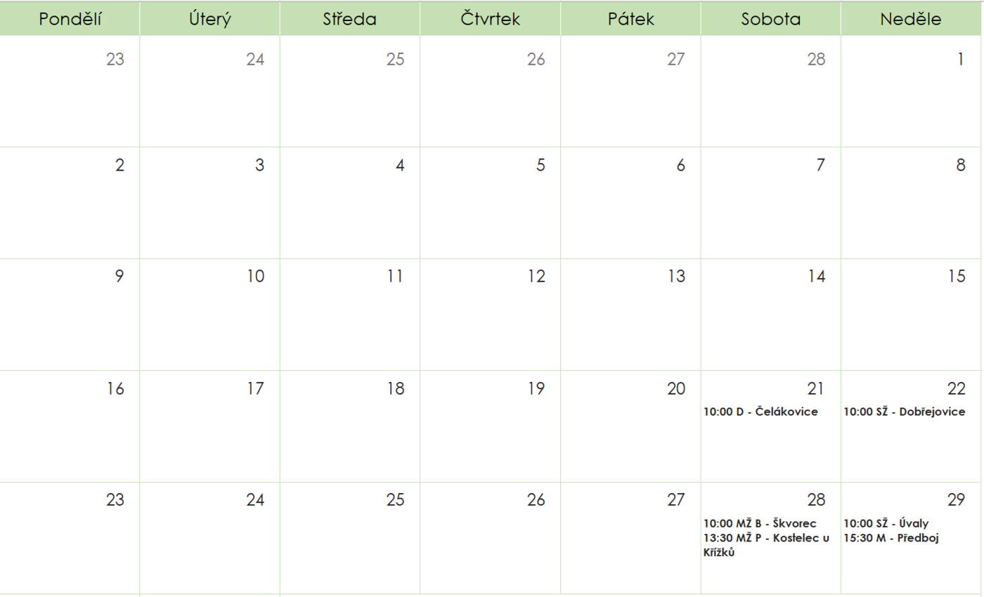 | Rozpis | Mini | Ml. Přípravka | St. Přípravka | Ml. Žáci | St. Žáci | Dorost | Muži |